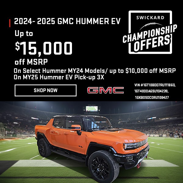 Cash from Financial Services, Inc. on the lease of a new 2024- 2025 GMC HUMMER EV from participating dealer's stock and subject to vehicle availability. Must lease through your dealer and Financial Services to qualify for cash and cash must be applied as capitalized cost reduction on lease. There is no cash back option. Lease terms on approved credit. Not all customers qualify. Cannot be combined with Other Cash Offer. Offer available in regardless of buyer's residency; void where prohibited. Expires Tue Mar 03 2026. See your participating dealer for details.